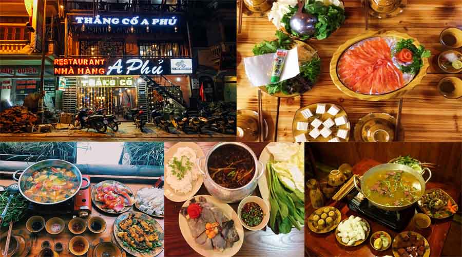Điểm đến cuối cùng không thể bỏ qua đó chính là A Phủ Quán - được mệnh danh là nhà hàng “đặc sản dân tộc”. Đến đây bạn sẽ được thưởng thức rất nhiều món ăn đặc sản của Sapa như: gà dao nướng than hoa, cá hồi chấm mù tạt, mẹt lợn cắp nách đủ món như xào, nướng, hấp… Bên cạnh đó, quán còn phục vụ cơm trắng ăn kèm với các món từ rau, củ tươi ngon của Sapa.