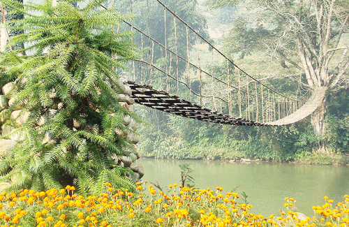 Cầu Mây mang một vẻ đẹp rất riêng bởi cầu được kết bằng dây mây. Trải qua một thời gian dài nên cầu cũng không còn được vững chắc như trước và giờ chỉ còn dùng cho mục đích du lịch. Phải thật can đảm bạn mới giám đi qua cầu vì mỗi ván cách nhau cỡ 20 cm. Nếu may mắn đi vào sáng sớm sương mù cuộn từ dòng sông phủ kín cây cầu, bạn sẽ có cảm giác như mình đang đi trong mây. Chính vẻ đẹp thơ mộng đó, nơi đây đã trở thành điểm đến hấp dẫn đối với du khách bốn phương, nhất là với những đôi uyên ương muốn lưu lại cho mình những khoảnh khắc đáng nhớ bên dòng sông Mường Hoa xinh đẹp.