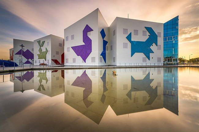 Công trình độc đáo này do một công ty của Hàn Quốc thiết kế theo ý tưởng trò chơi gấp giấy Tangram nổi tiếng của Nhật Bản.