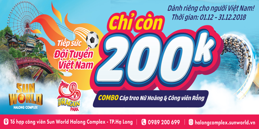 Chỉ với 200.000 đồng cho người lớn và 150.000 đồng cho trẻ em bạn đã có thể thỏa thích vui chơi tại Sun World Hạ Long Comple rồi này! Ưu đãi này được áp dụng đến hết 31/12 cho du khách là người Việt. Tọa lạc ngay trung tâm khu du lịch Bãi Cháy, cách Hà Nội 1,5 tiếng di chuyển,nơi đây được xem như một thiên đường vui chơi giải trí hiện đại với cáp treo Nữ Hoàng, quần thể vui chơi trên đỉnh Ba Đèo, công viên chủ đề Dragon Park và công viên nước Typhoon Park.