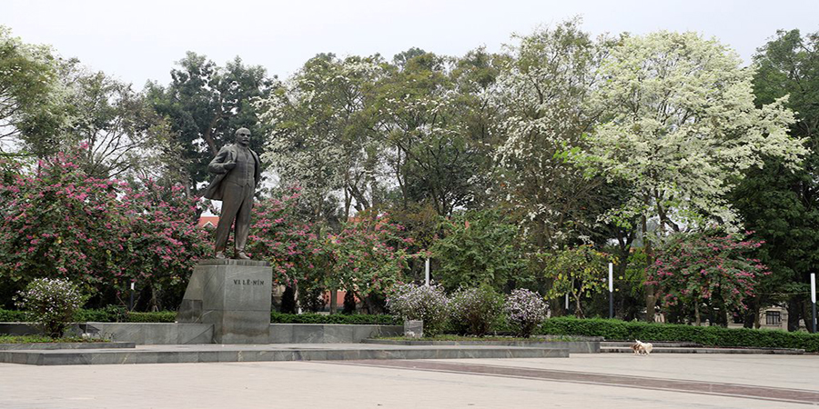 Xung quanh tượng đài trong công viên Lenin, bạn cũng tìm thấy nhiều cây sưa đang rộ nở, xen lẫn những cây hoa ban tím, nếu đi trên đường Điện Biên Phủ.