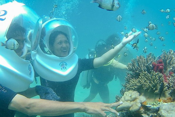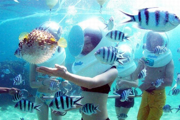Đi bộ dưới đáy biển là hình thức giúp du khách tận hưởng những giây phút dạo biển, ngắm cảnh dưới lòng biển với hàng trăm loài san hô và động vật thủy sinh.