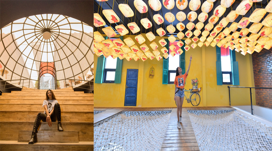 Tại tầng 2, còn có quán cà phê với những góc chụp ảnh rất nghệ thuật: những chiếc võng khổng lồ trên không, mái vòm bằng kính, những bức tường 3D đẹp thật….thỏa thích cho các nàng sống ảo.