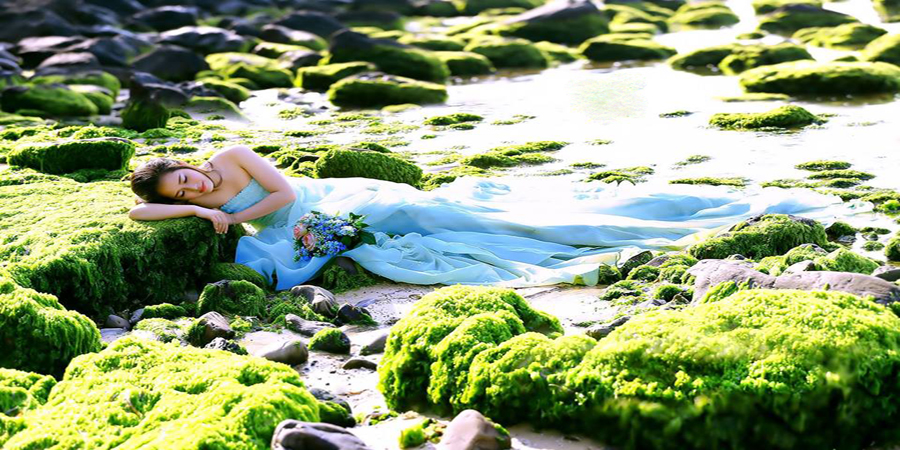 Bạn nên đến nơi đây vào buổi sáng sớm, khi bình minh vừa ló ánh dương, những tia nắng bắt đầu ngày mới chiếu rọi trên những tảng đá bám đầy rêu còn ướt nước biển tạo nên một bức tranh đẹp tựa chốn bồng lai tiên cảnh. Để rồi khi thủy triều xuống, những đám rêu phơi trong nắng dần trở nên bạc trắng, óng ánh như tơ. Khiến các bạn trẻ không khỏi háo hức để đến “sống ảo” tại thiên đường rêu xanh lên hình "thần thánh" này!