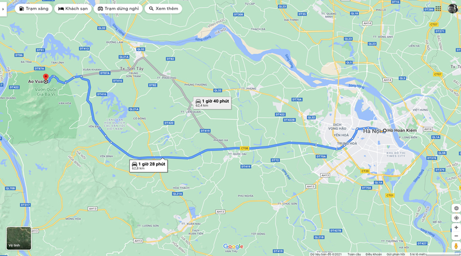 Từ Hà Nội, bạn lựa chọn cung đi đường quốc lộ 32 hoặc theo lối đại lộ Thăng Long. Mình khuyên bạn nên đi đường đại lộ Thăng Long sẽ nhanh và tiện hơn, xe đi hết đại lộ vào đường 87, đến ngã ba giao với đường Đá Bạc thì rẽ trái, đi thêm 7km nữa là đến Ao Vua nhé, thời gian đi chỉ mất khoảng hơn 1 tiếng.