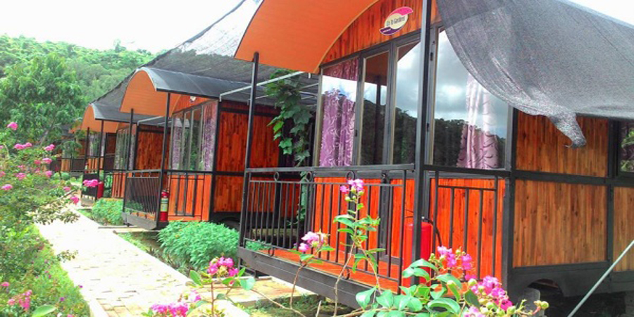 Khu nhà gỗ với 28 căn được thiết kế độc đáo với gam màu chủ đạo là màu ấm nóng của gỗ hòa quyện cùng màu xanh của khu rừng nguyên sinh liền kề đã khiến nơi đây trở nên thơ mộng, tươi mát, thoáng đãng và vô cùng trong lành.
