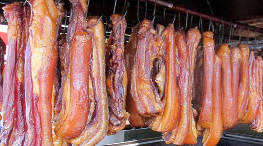 Là món ăn phổ biến của đồng bào các dân tộc thiểu số ở Sa Pa. Thịt xông khói được làm từ phần thịt vai và nạc lưng của lợn, trâu, bò, ngựa. Để làm thịt xông khói, người ta phải nọc sạch mỡ và gân, cắt thành các miếng vuông dày 2-3 cm, sau đó ướp lá mắc khén giã nhỏ, muối hột, ớt và hạt chuối rừng giã nhuyễn. Cuối cùng là treo lên gác bếp củi, hơi nóng và khói bếp không chỉ bảo quản thịt không bị hỏng mà còn mang mùi vị rất riêng vào từng thớ thịt. Thịt xông khói xào với cải mèo sẽ là món ăn rất lạ miệng, đủ để níu chân những du khách phương xa.