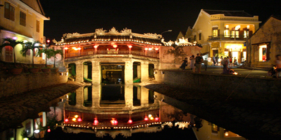 Khi đêm xuống, chùa Cầu bỗng trở nên đẹp lạ kì hơn bao giờ hết. Toàn cảnh Chùa bỗng được chiếu sáng bởi những chiếc đèn lấp lánh, liên tục thay đổi màu, mở ra trước mắt du khách một bức tranh đa màu sắc tuyệt đẹp.