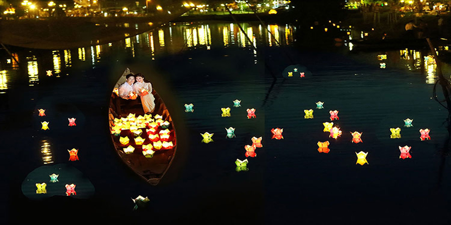 Đến với Hội An một trải nghiệm vô cùng thú vị mà được rất nhiều các cặp uyên ương yêu thích đó là ngồi thuyền và thả đèn hoa đăng trên sông Hoài. Bạn có thể thuê một chiếc thuyền nhỏ xuôi dòng sông Hoài, lặng ngắm Hội An về đêm rồi tự tay thả những chiếc đèn hoa đăng nhỏ, lấp lánh mang theo những hi vọng, mơ ước của mình. Những chiếc đèn hoa đăng nhỏ xinh được bán với giá từ 3000 – 10.000 đồng dọc các tuyến phố của Hội An. Đây được xem là trải nghiệm thú vị nhất khi bạn được tận tay tô điểm vào bức tranh ánh sáng tuyệt đẹp trên dòng sông Hoài đầy thơ mộng này.