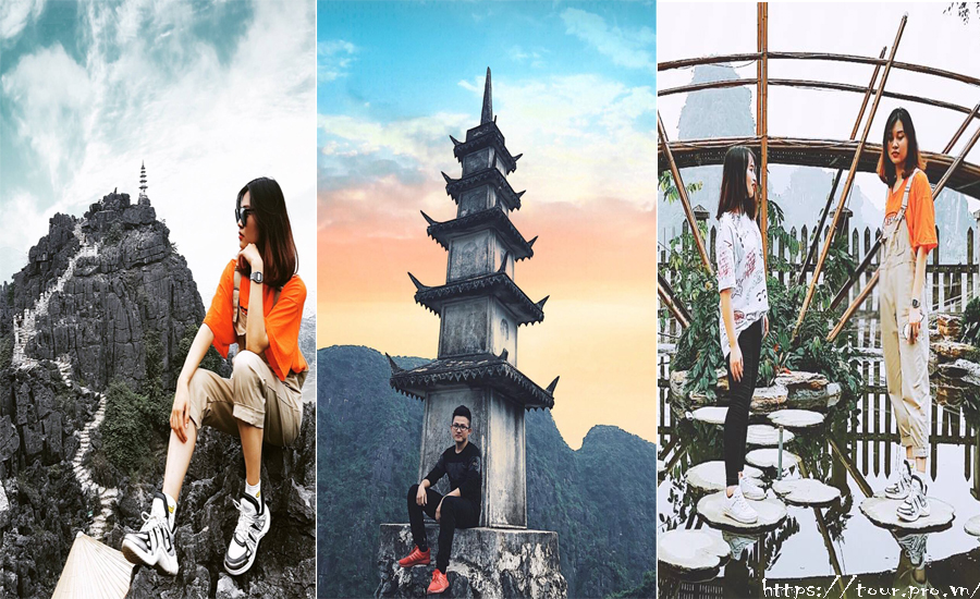 Khi leo lên tới hơn nửa chặng đường sẽ tới một ngã ba, một bên là con đường dẫn lên trên đỉnh núi đặt tượng Quan Thế Âm Bồ Tát đứng nhìn xuống mảnh đất cố đô Hoa Lư cùng tượng rồng chầu được điêu khắc bằng đá oai phong, một bên là con đường dẫn lên đỉnh tháp được xây dựng theo kiến trúc bảo tháp Phật giáo nằm cheo leo trên mỏm đá hẹp - nơi tạo nên những bức hình sống ảo cực kỳ ảo diệu của các bạn trẻ.