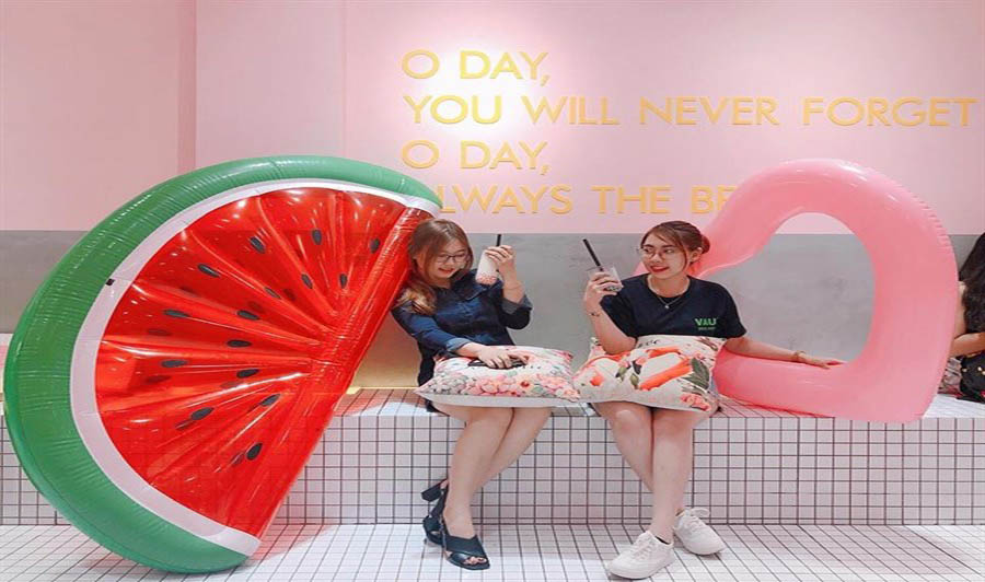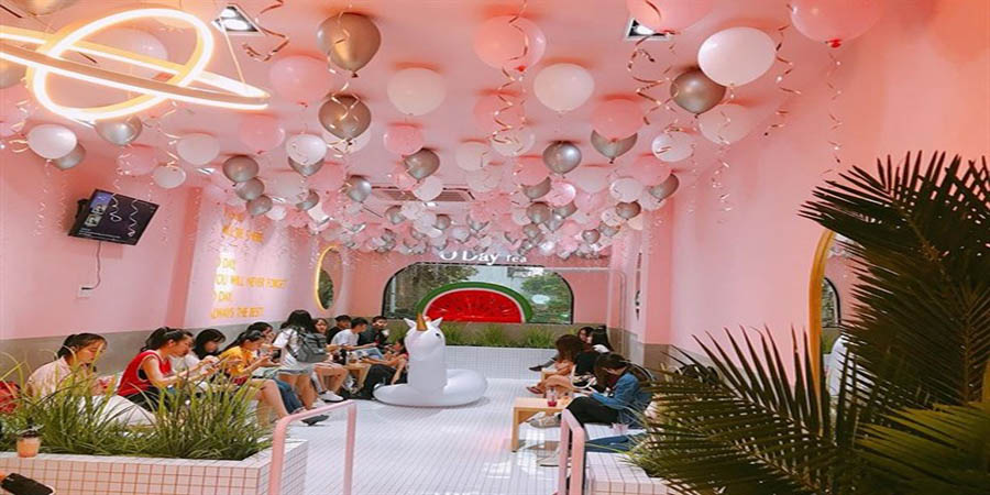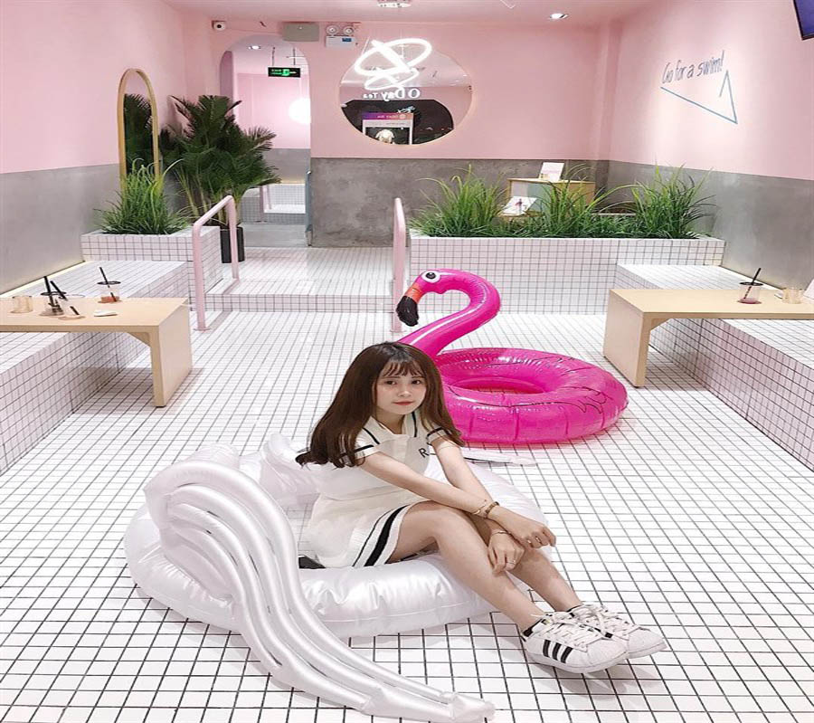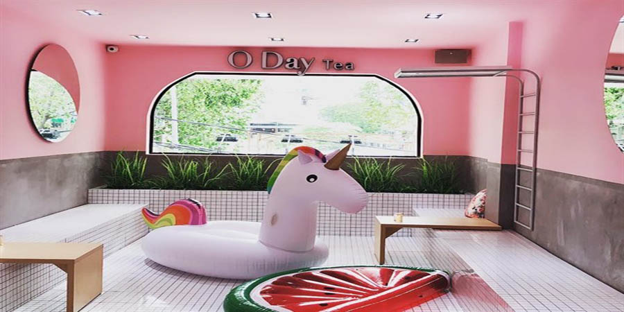Oday Tea Việt Nam là một trong những thiết kế vô cùng độc và lạ của Sài Gòn khi được xây dựng 2 tầng thành hồ bơi thu nhỏ mang tone trắng hồng ngọt ngào, nhẹ nhàng bao phủ khắp nơi cùng những em phao kỳ lân và dưa hấu khổng lồ được đặt ngay giữa phòng.