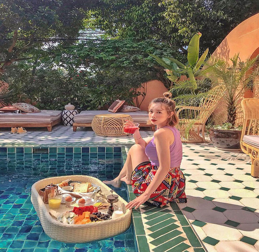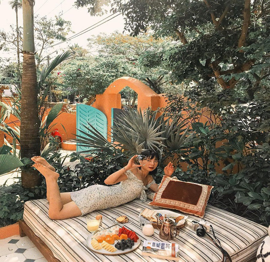 Khi đến với nơi đây bạn sẽ không khỏi choáng ngợp với màu cam đất đặc trưng của vùng Morroco với điểm nhấn là chiếc cửa màu xanh dương nổi bật. Bước vào bên trong, du khách sẽ bị choáng ngợp với khung cảnh sân vườn đẹp mắt cũng như cảm nhận được sự thoáng mát khi ngồi dưới băng ghế dài có mái tre là những thanh gỗ nhỏ xinh ghép lại.