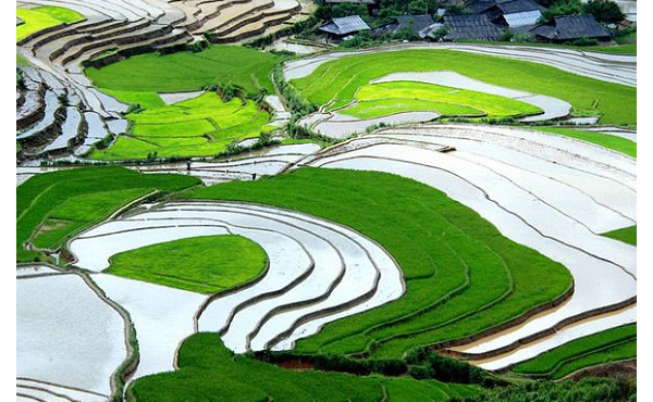 Thật khó mà diễn tả hết những cung bậc cảm xúc khi đứng ở độ cao, nhìn xuống những tràn ruộng bậc thang mùa đổ nước. Sau mùa cày ải đất, nước được dẫn từ đỉnh núi xuống, theo những mương nước dẫn những dòng nước mát lành đổ vào từng tràn ruộng. Cứ thế, màu nước bạc hòa lẫn màu vàng của đất, tạo nên một gam màu sóng sánh, sóng sánh… Dưới nắng sớm ban mai, hay nắng chiều nghiêng soi, hay trong những ngày mây phủ, những tràn ruộng bậc thang mùa đổ nước đều đẹp một cách thơ mộng.