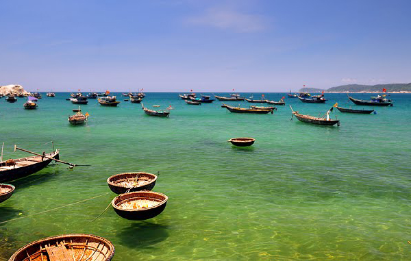 Đứng trên cao nhìn xuống biển bạn sẽ không khỏi ngỡ ngàng với cảnh tượng tuyệt đẹp trước mặt. Hàng trăm con thuyền của ngư dân đang neo đậu trước những hàng dừa trên bờ in bóng xuống mặt nước biển trong xanh ngắt.