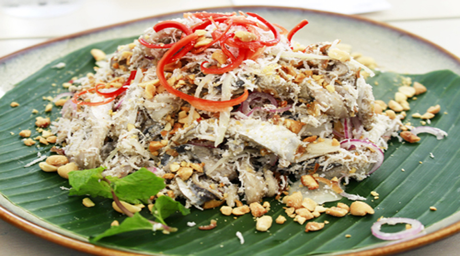 Gỏi cá trích là một món đặc sản của biển Phú Quốc mà thực khách đến đây chẳng thể bỏ qua. Gỏi cá trích được làm từ những con cá tươi ngon nhất bắt theo ngày, món ăn đầy đủ dinh dưỡng mà vô cùng thanh đạm. Gỏi ăn kèm các loại rau sống và bát nước chấm rất riêng có thêm chút đậu phộng.
