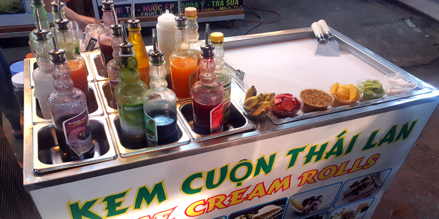 Món kem độc đáo có nguồn góc từ Thái Lan này hấp dẫn không chỉ bởi mùi vị mà còn vì cách mà du khách được chính mắt quan sát quá trình làm nên món kem vô cùng nhanh nhạy và khéo léo.