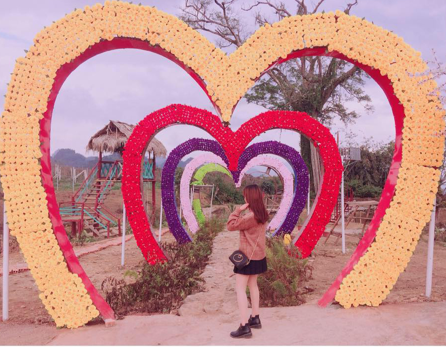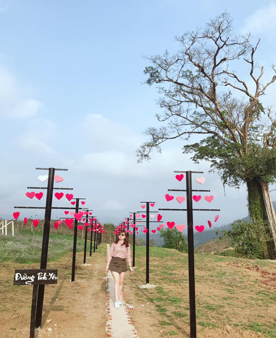Tại đây có khá nhiều không gian lý tưởng dành cho du khách check – in sống ảo như con đường tình yêu, cầu gỗ, vườn chong chóng,...kết hợp với trang phục cổ trang lạ mắt.